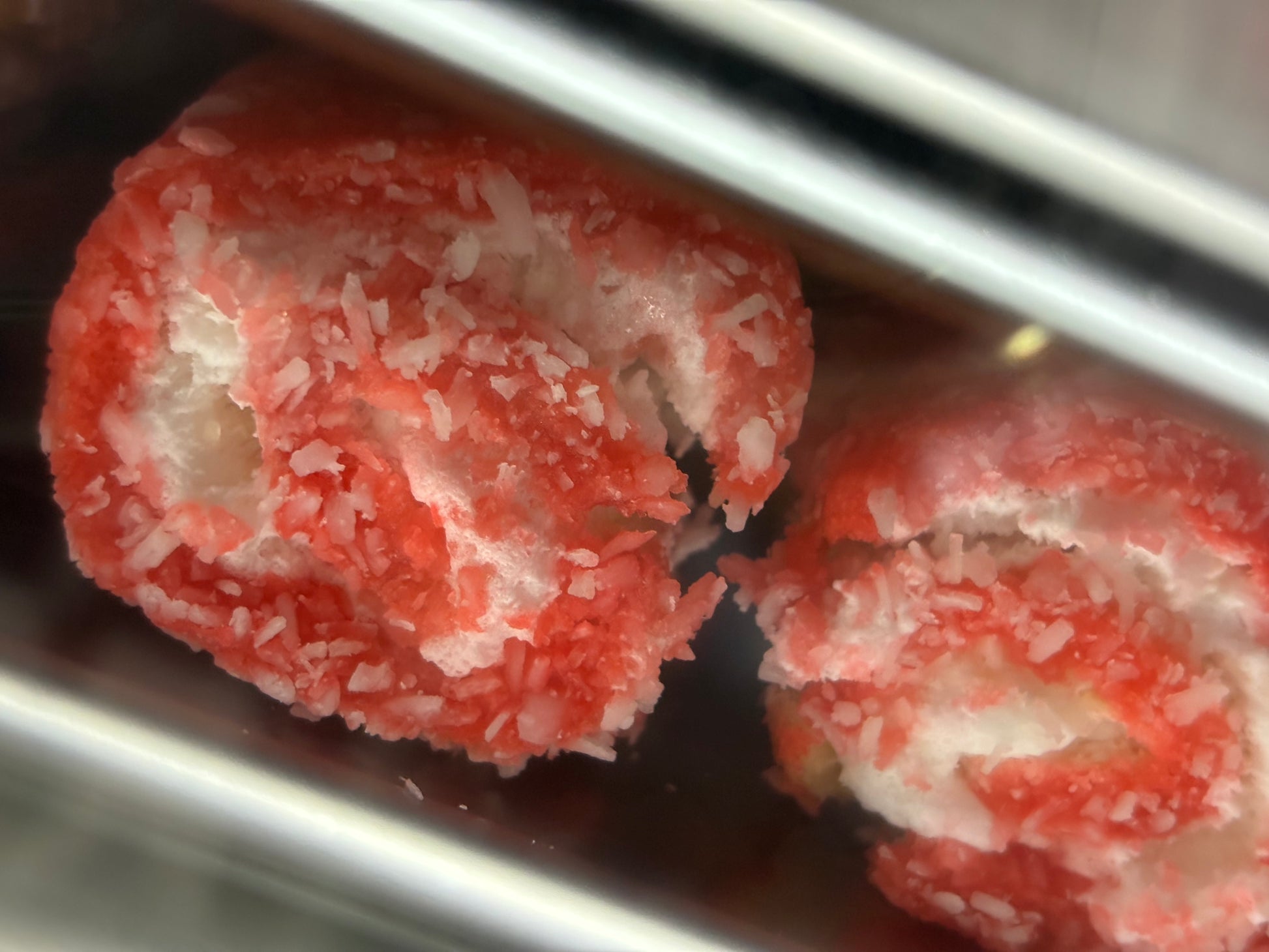 Freeze Dried rolled sponge cakes filled with a delightful jelly and cream centre. Sprinkled with sweet coconut